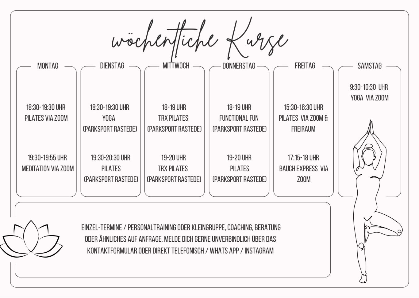 Beides beeinflusst sich gegenseitig und benötigt gleichermaßen deine Aufmerksamkeit & Fürsorge. Ich biete dir hierzu verschiedene Möglichkeiten aus Pilates, Yoga, Meditation, Ernährungsberatung und persönliches Coaching sowohl online (live) als auch persönlich im Raum Varel, Oldenburg, Rastede und umzu. Mehr Informationen zu den einzelnen Bereichen findest du oben über das Menü - oder melde dich direkt bei mir.